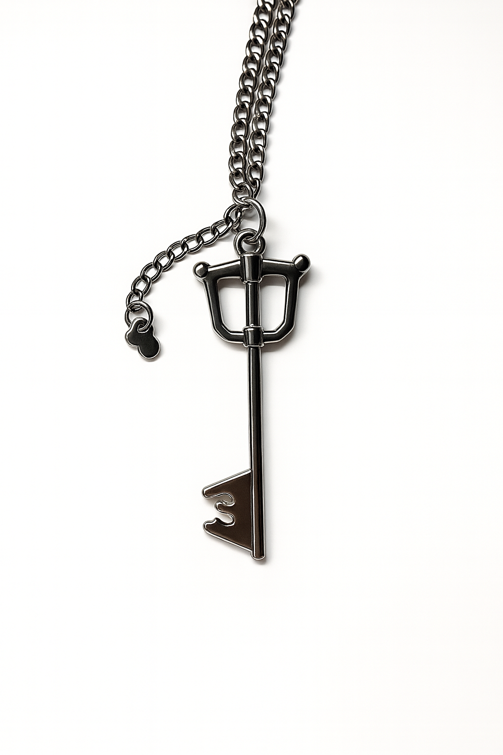 Elegante colgante metálico inspirado en la legendaria Keyblade de la saga Kingdom Hearts. Acabado en plateado brillante, con cadena resistente y detalle icónico de Mickey Mouse en el extremo. Ideal para fans y coleccionistas.