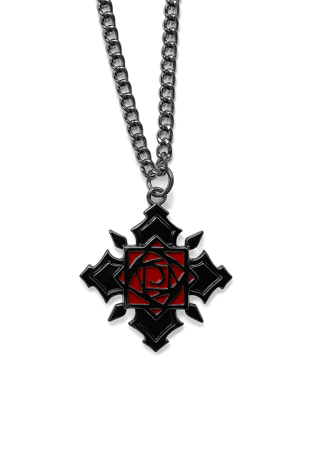 Collar metálico con cadena de eslabones y colgante en forma de cruz estilizada con detalles en negro y rojo, representando el emblema de los Heartless (Sincorazón) de la saga Kingdom Hearts. Su diseño oscuro y elegante lo convierte en un accesorio imprescindible para fans, cosplayers y coleccionistas que buscan una pieza única del universo de Kingdom Hearts.