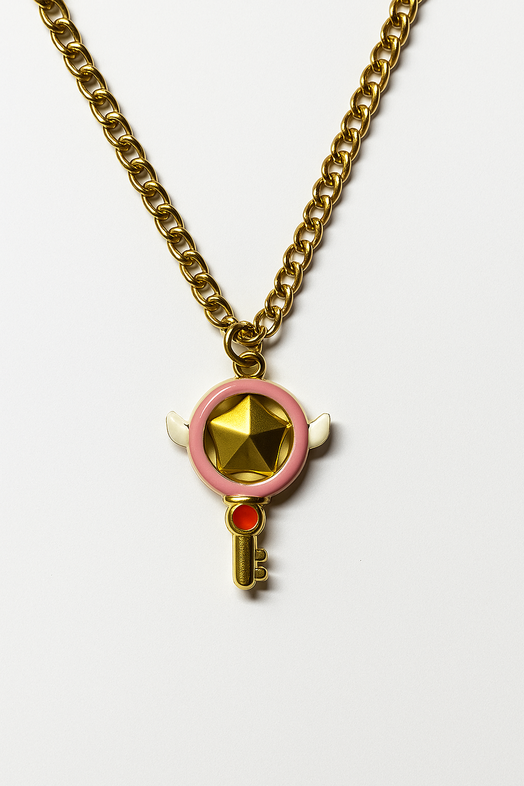 Collar metálico inspirado en el báculo mágico de Cardcaptor Sakura. Con un diseño detallado en dorado, rosa y blanco, incluye la icónica estrella central y pequeños detalles esmaltados que le dan un acabado brillante y elegante. Perfecto para fans del anime y coleccionistas, este colgante es un accesorio único para llevar siempre un toque de magia contigo.