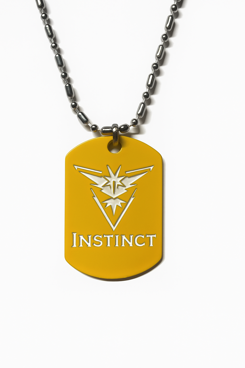 Placa metálica tipo militar con el emblema y nombre del equipo Instinct, representado por el legendario Zapdos. Con acabado en color amarillo brillante y cadena metálica de eslabones, es un accesorio resistente y llamativo, ideal para entrenadores que quieren mostrar con orgullo su lealtad al Team Instinct en Pokémon GO. Perfecto tanto para uso diario como para coleccionistas.